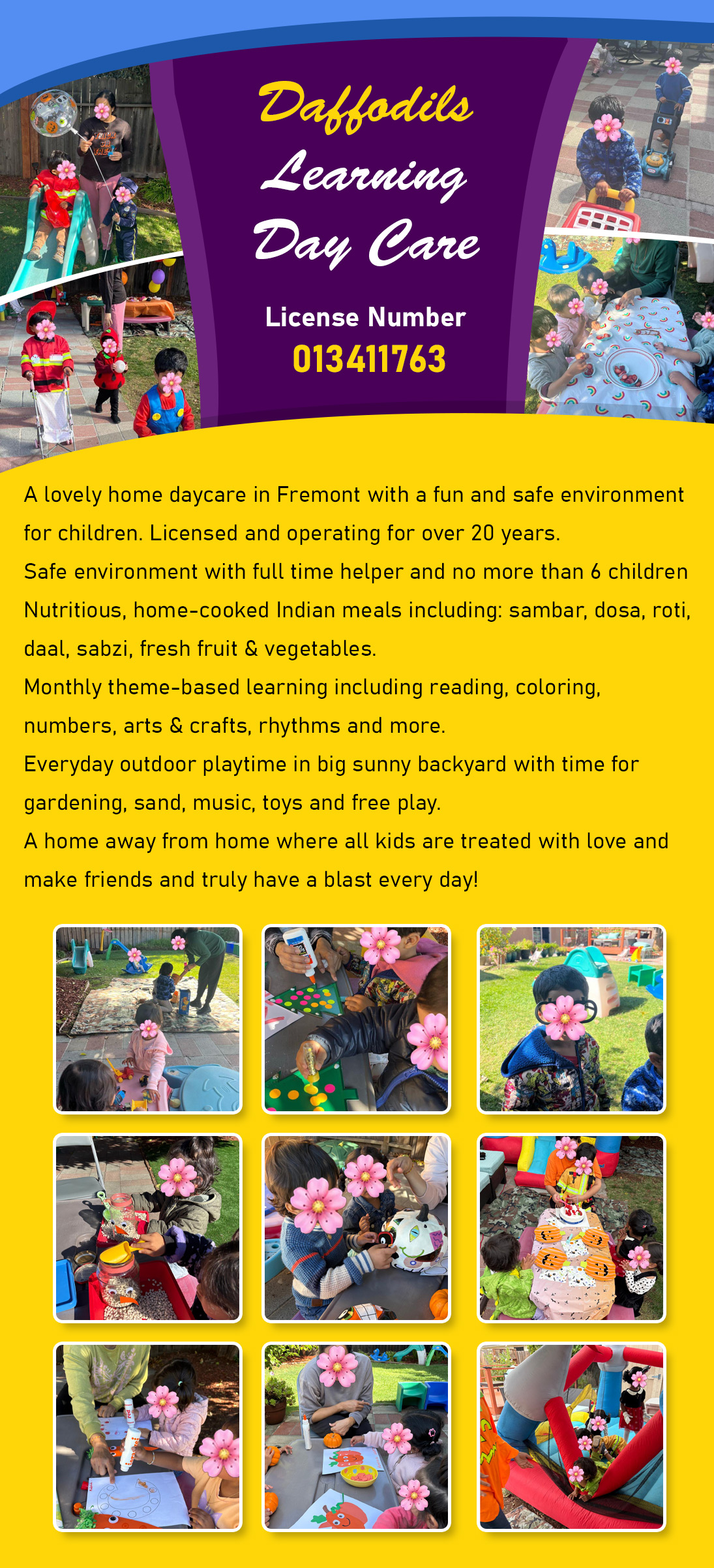 Rated 5.0 I started sending my daughter to Daffodils day care when she was 2.5 yrs old . Gurpreet and her team is very caring and take utmost care of your kids , you would feel they are in great hands when you are not around , she gives freshly cooked meals and as my daughter is a lill choosy she used to cook lunch of her choice other then the routine stuff . They do great projects together and she has a big backyard which is a boon for kids to play outdoors and not just be locked in a room throughout the day , they make birthdays special by decorating the full deck and backyard with kids having a full party like feel. The best part is they are not after increasing the kids count and always keep a limited number of same age group kids . When you pick your kids in evening you will find them as fresh n clean as you drop in the morning , they will wipe/comb them after nap time which shows the time they invest on each kid. I dropped for COVID -19 but my daughter still remembers and misses Gurpreet and Urmila a lot. Thanks for taking care of our loved ones .